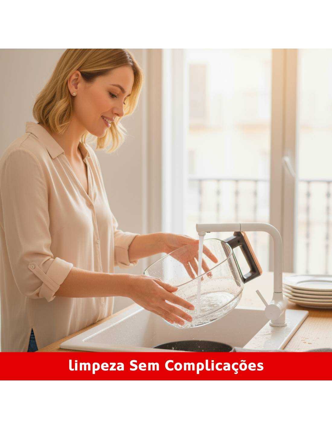 A limpeza é rápida e simples graças a cuba em vidro que pode ser colocado na máquina de lavar loiça para uma limpeza sem complicações.