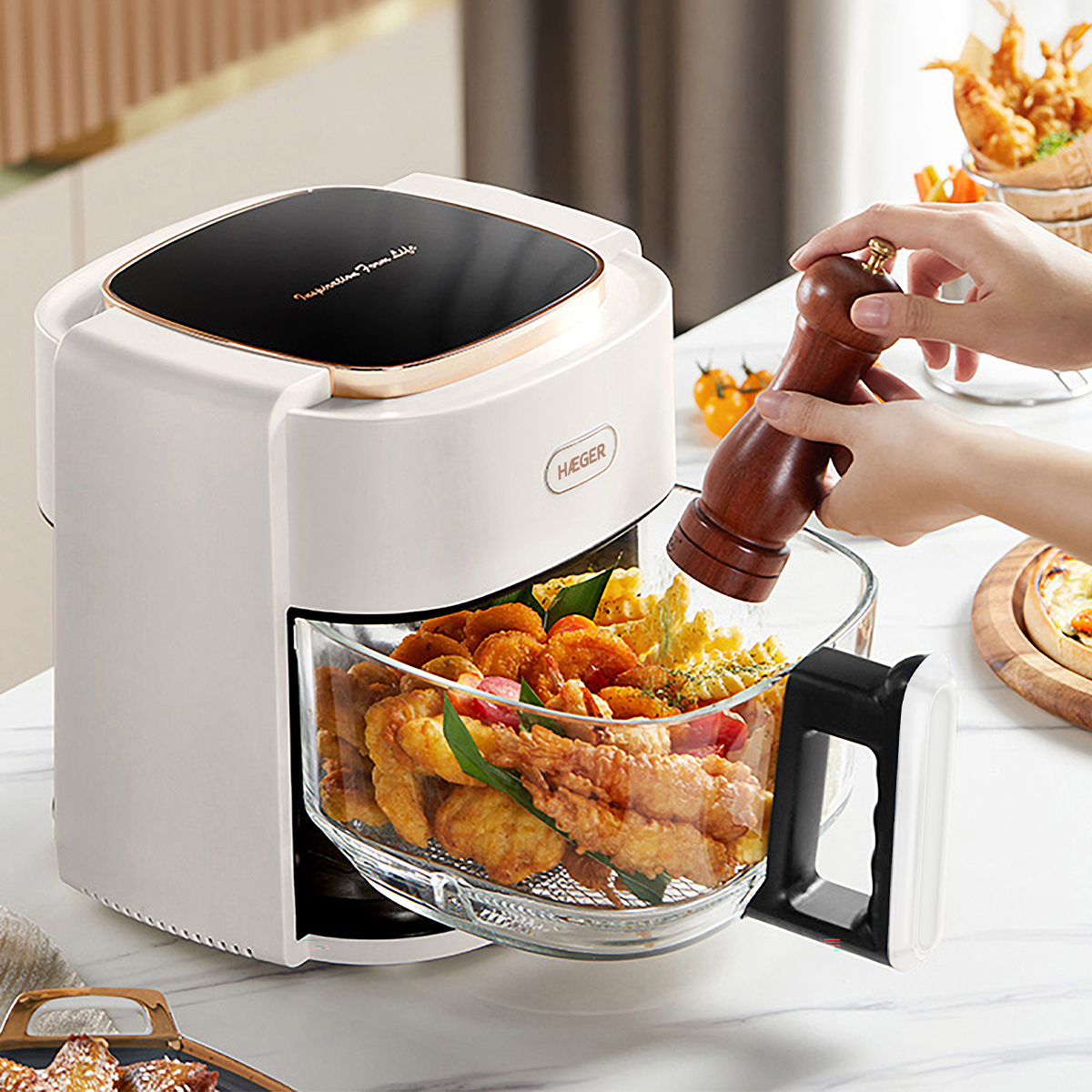 Esta fritadeira sem óleo está preparada para cozinhar diferentes tipos de alimentos: batatas fritas, frango, hamburguers, camarão, carne, peixe, etc. Basta selecionar o programa pretendido e deixá-la funcionar sozinha!