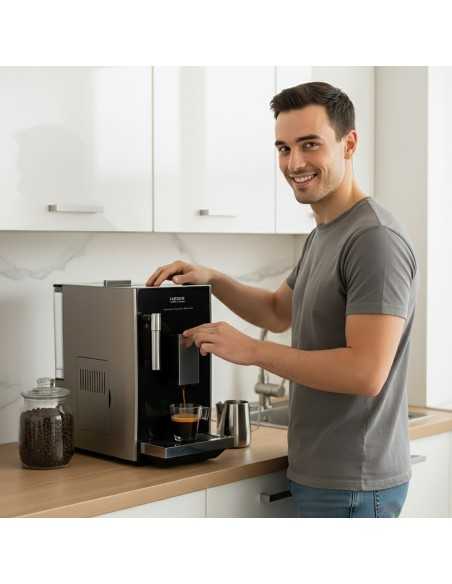 Com um design moderno e compacto, a HAEGER Caffè Crema conjuga funcionalidade e elegância. O acabamento premium em aço escovado, combinado com painéis em preto brilhante, confere-lhe um visual sofisticado, enquanto as linhas direitas e a interface tátil garantem uma utilização simples e intuitiva. É o toque final perfeito para transformar qualquer espaço numa verdadeira experiência de café com qualidade profissional.
