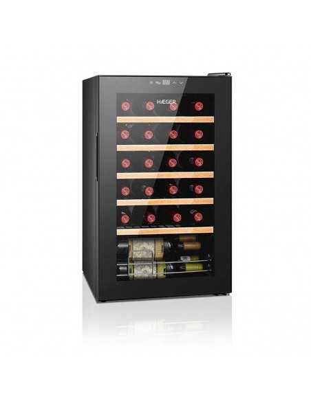 Cave de vinho HAEGER Chateaux 24 com capacidade para 24 garrafas, este modelo silencioso dispõe de controlo sensível ao toque e sistema de refrigeração com compressor. Com temperatura ajustável, iluminação interior e porta em vidro duplo, a sua coleção estará no centro das atenções.
