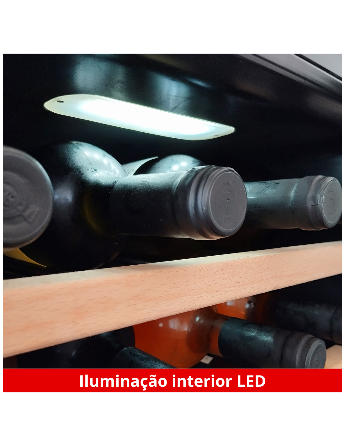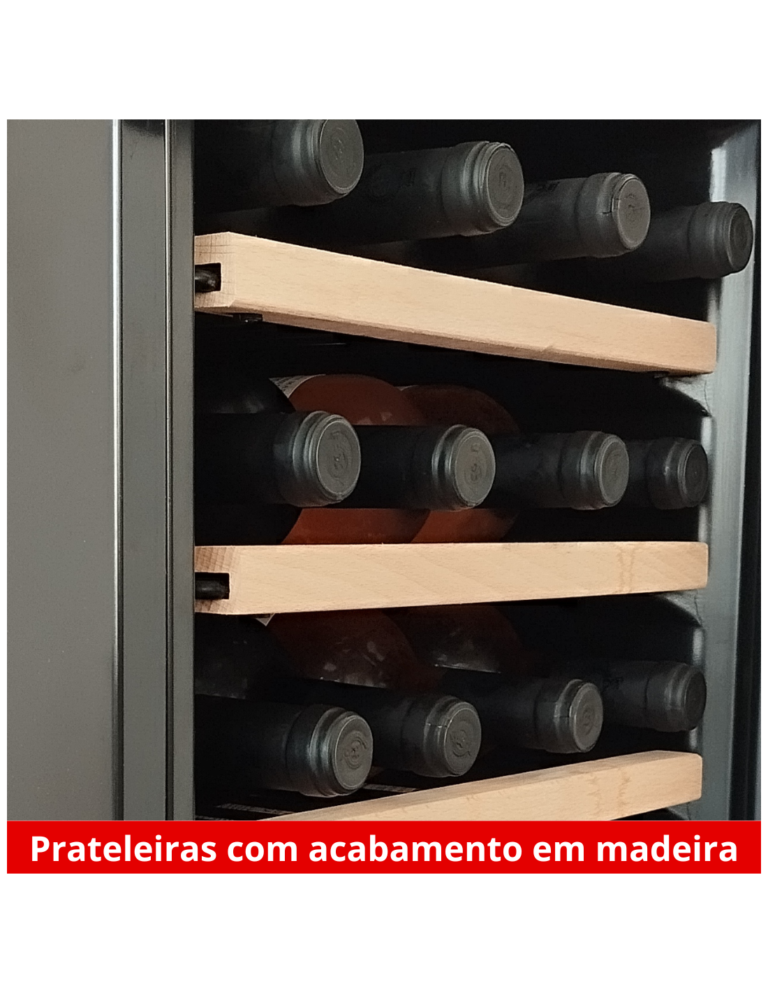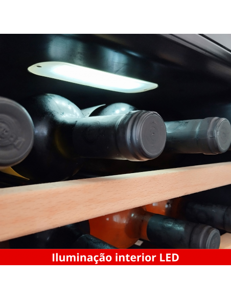 Equipada com 5 prateleiras mais uma base, que alojam até 4 garrafas cada, a disposição interna é flexível e funcional. O compressor de alta eficiência sem CFC, modelo R600a, é ecologicamente correto e assegura um funcionamento silencioso, permitindo que o único ruído presente seja o de celebrações e conversas agradáveis.