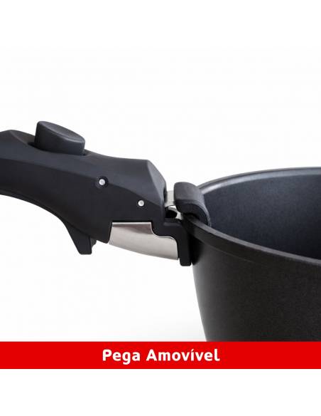 Graças ao revestimento antiaderente e à pega amovível, o conjunto é simples de higienizar, fácil de arrumar e ideal para cozinhas compactas ou para quem valoriza a organização.