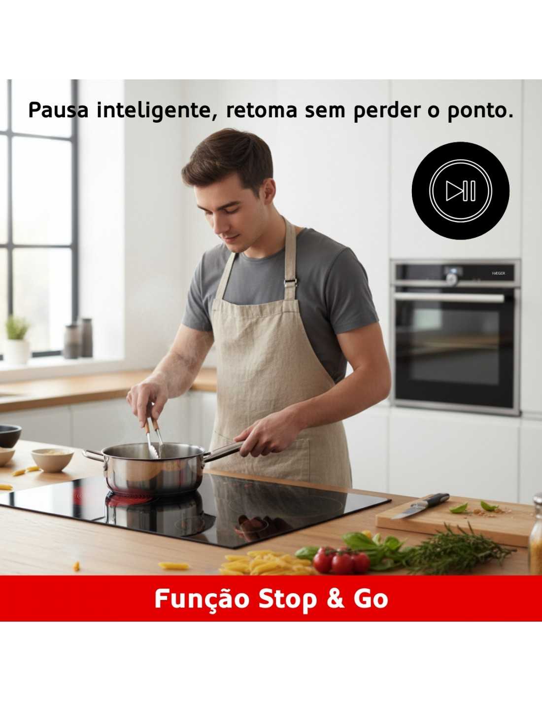 Perfeita para os imprevistos do dia a dia. Se precisar de interromper a confeção, ative a função Stop & Go: todas as zonas desligam temporariamente e, com um simples toque, retomam a potência anteriorm sem perder o ponto da receita.