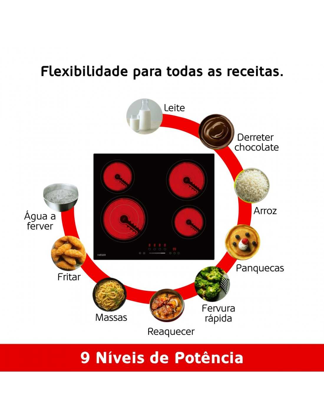 Equipada com bloqueio para crianças, indicador de calor residual, proteção contra transbordamento e sobreaquecimento e desligamento automático, para uma utilização totalmente segura.