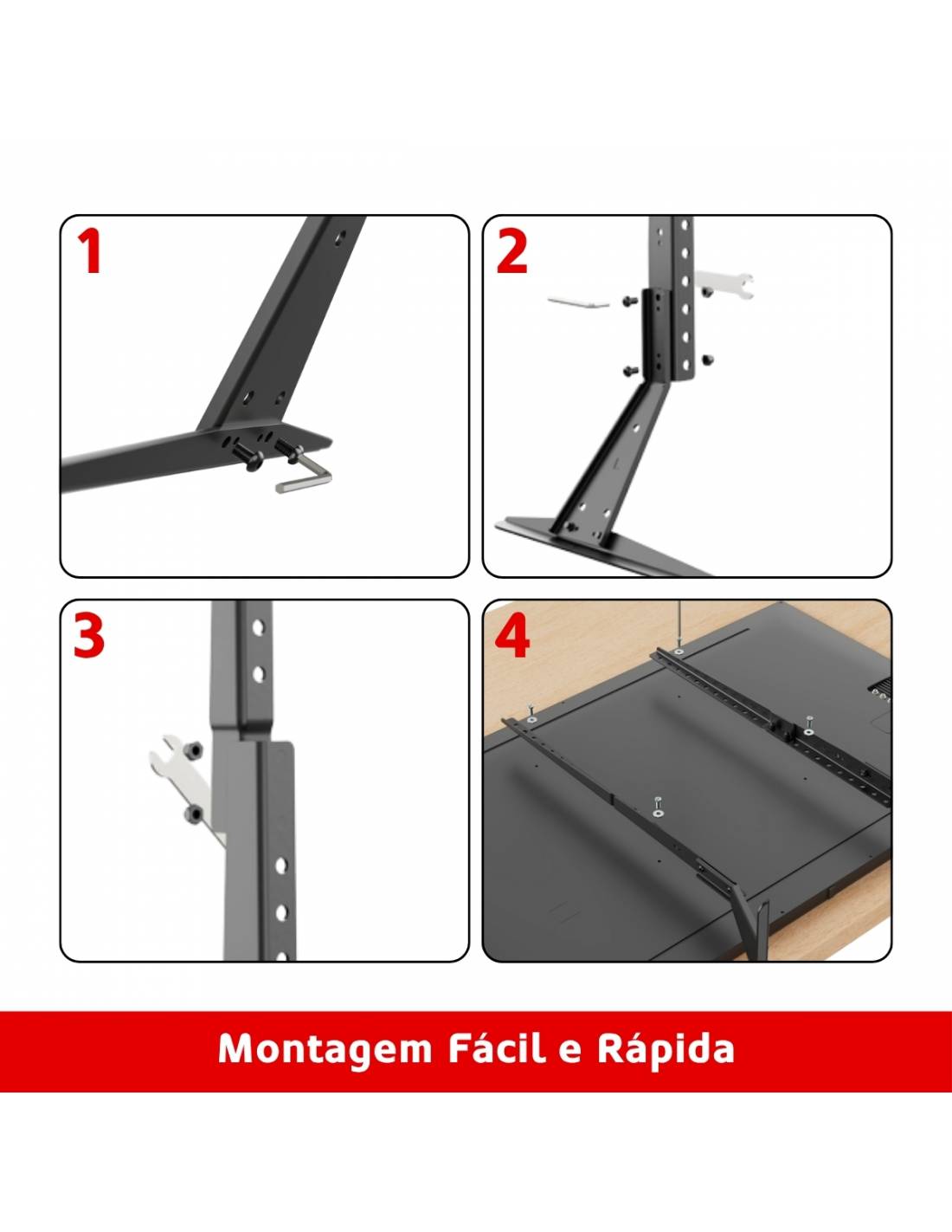 Fabricada em aço reforçado, suporta televisores até 40 kg, oferecendo máxima estabilidade e resistência no uso diário.