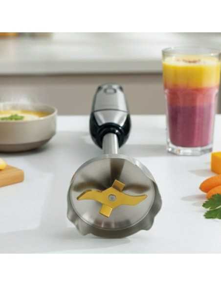 O segredo deste equipamento reside na sua lâmina de elevado desempenho revestida a titânio. Diferindo das lâminas comuns, o titânio preserva o corte por um período consideravelmente mais longo e oferece uma resistência excecional. Com 5,4 cm de diâmetro, a lâmina gera um vórtice ideal que processa os alimentos de forma homogénea e célere.